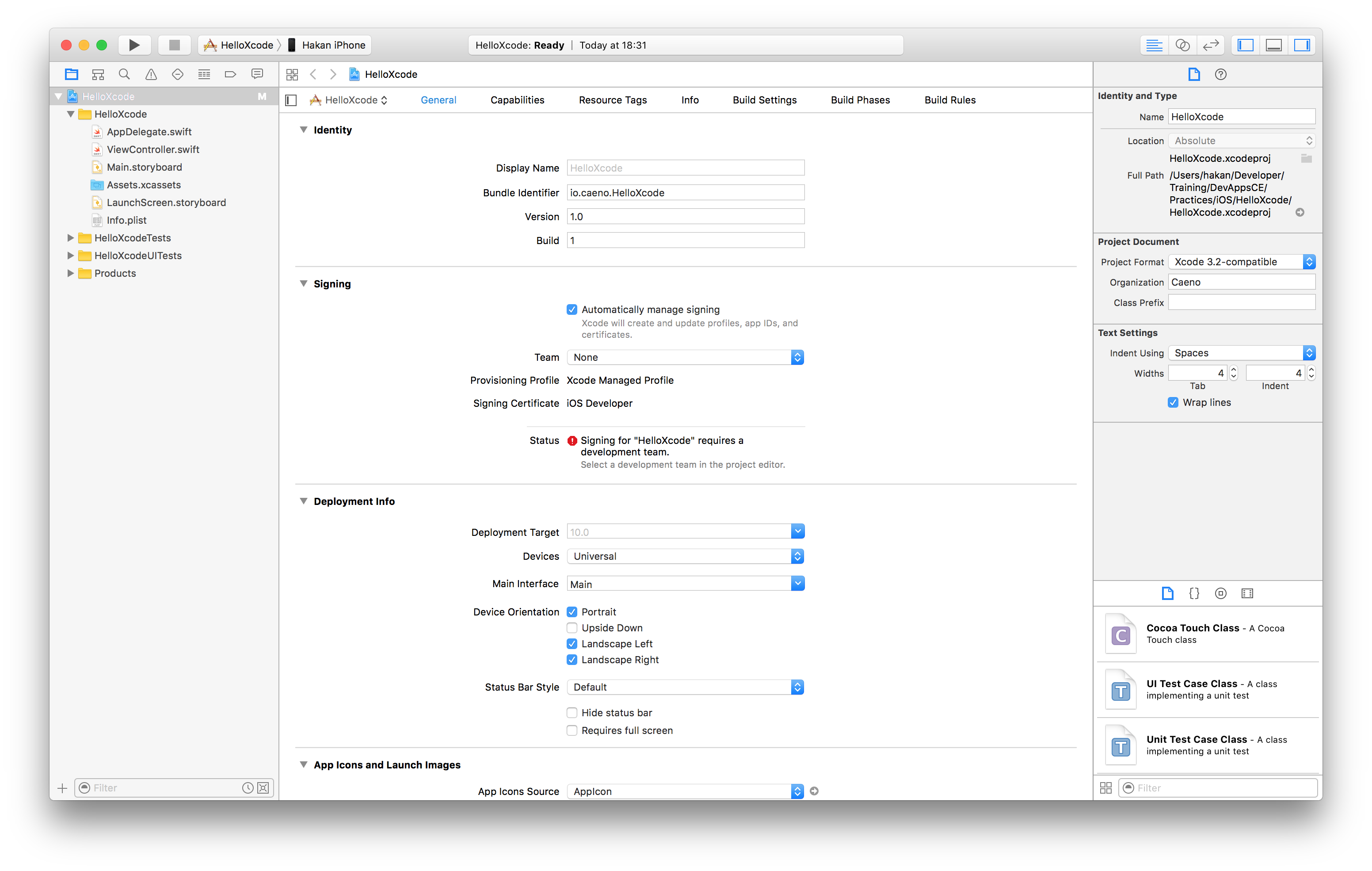 Clique no botão Next. O Xcode solicitará a pasta onde o projeto deve ser criado. Selecione uma pasta em seu disco para organizar seus projetos e clique em OK. Seu projeto será criado e a tela principal do Xcode será apresentada: