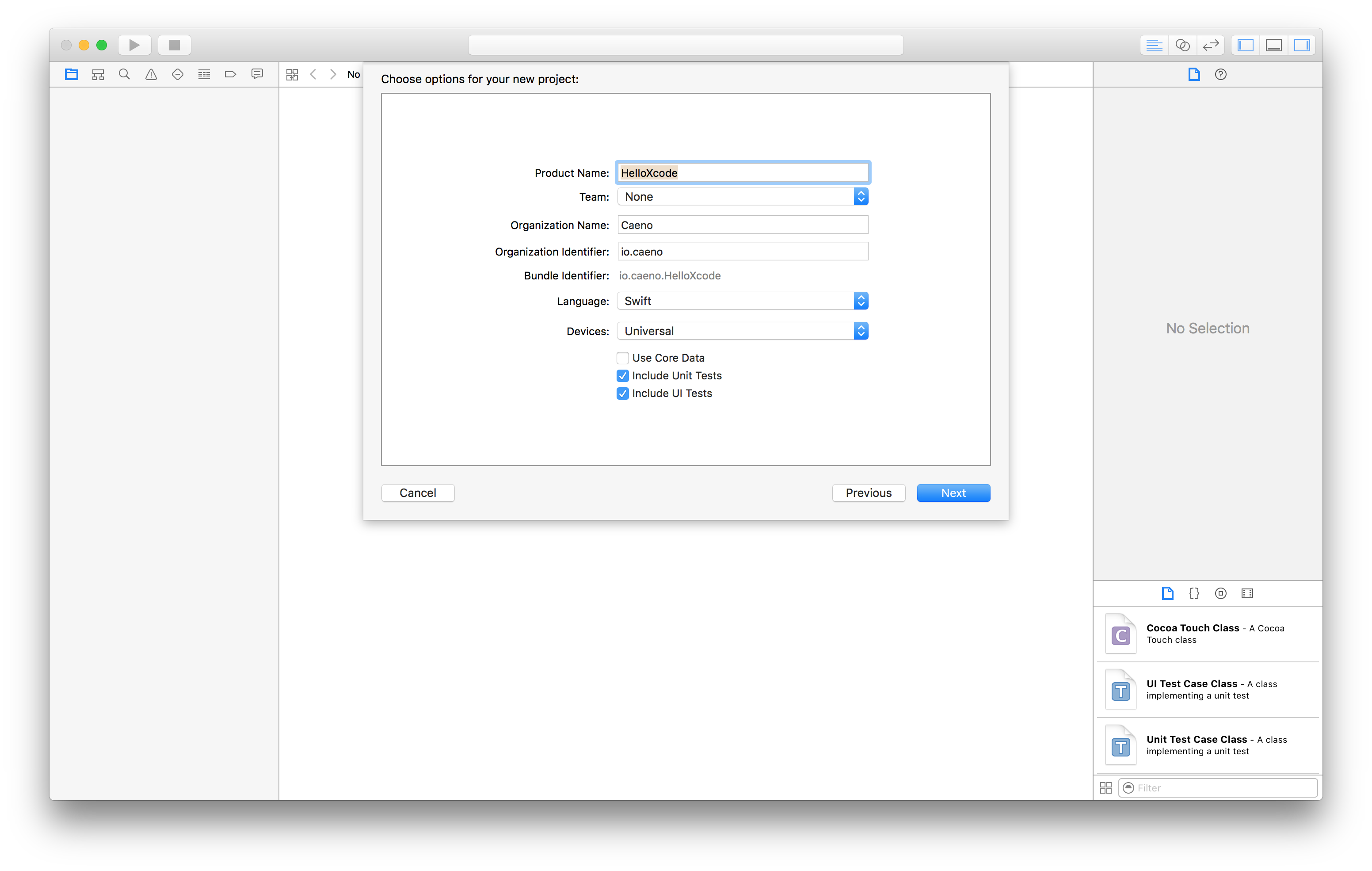 - Include Unit Tests (Incluir Testes Unitários): ao marcar essa opção o Xcode inclui as estruturas básicas para criação de testes unitários, uma forma de escrever testes automatizados para seu código. Tanto faz a marcação dessa opção visto que não faremos uso dela nesse momento.