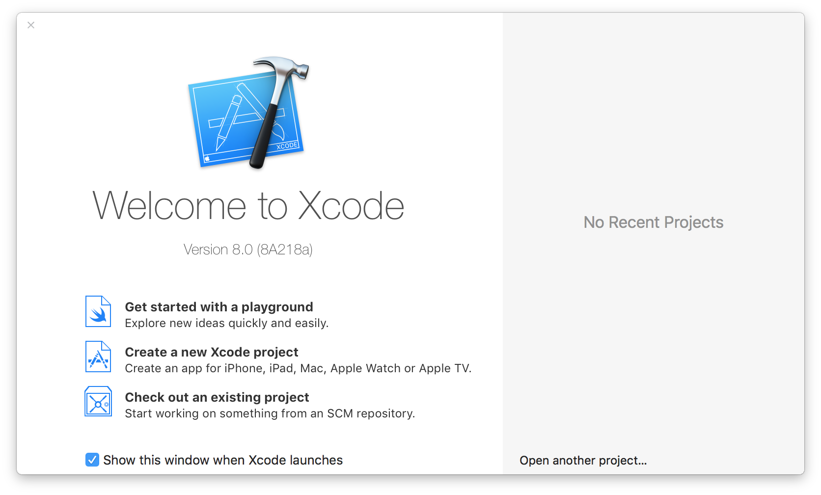 Nesse exercício vamos criar nosso primeiro projeto de App para iOS usando o Xcode. Localize o programa em seu computador (usando o Spotlight ou o Launchpad). Ao abrir o programa a tela de boas-vindas é apresentada: