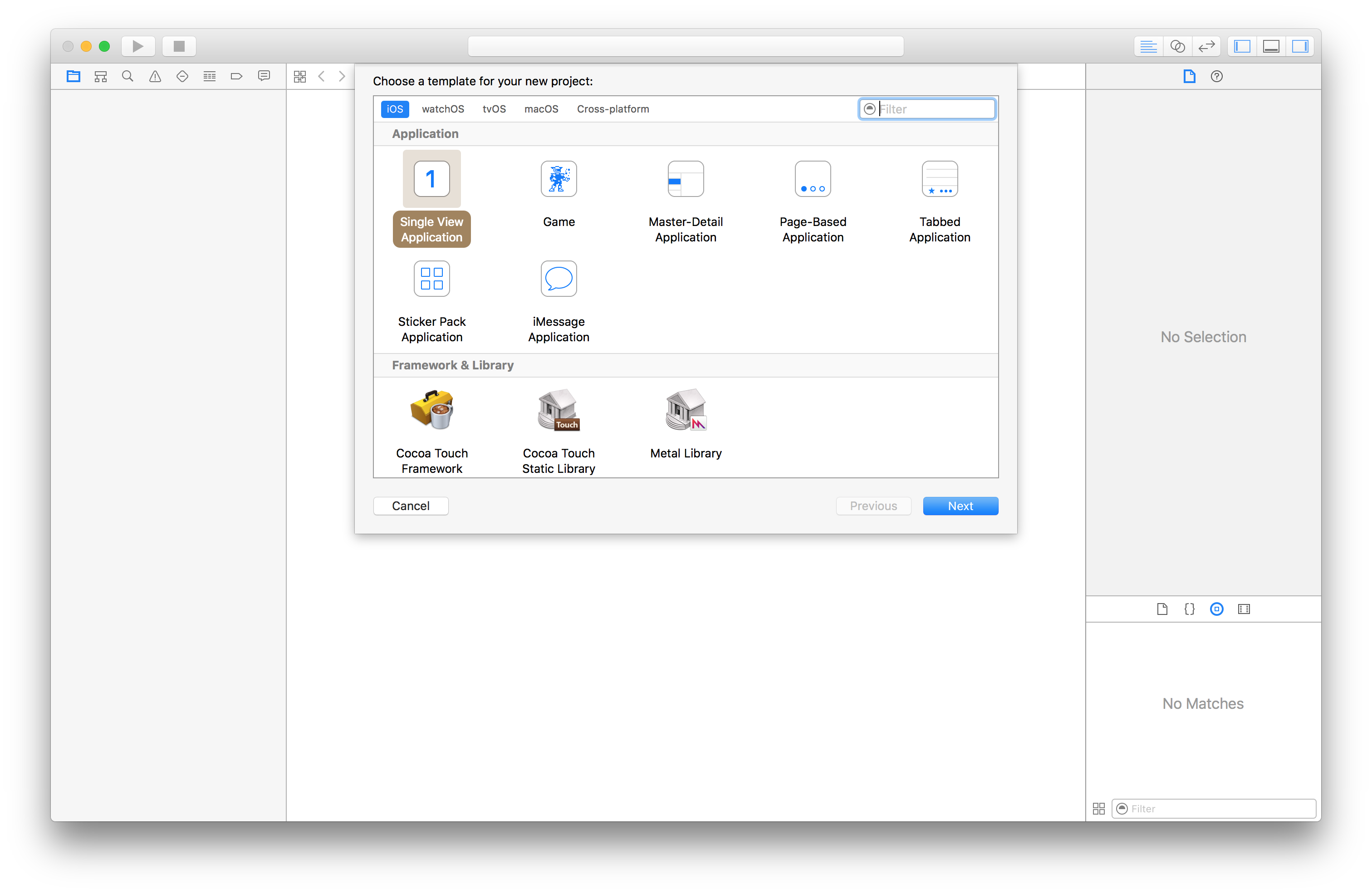 Note que o Xcode oferece diversos Templates de Projetos para as diversas plataformas para qual é possível desenvolver aplicações com ele, atualmente iOS (para iPhones e iPads), watchOS (para Apple Watches), tvOS (para Apple TV’s de quarta geração em diante) e macOS (para computadores Macintosh). Nesse curso vamos explorar apenas o primeiro.